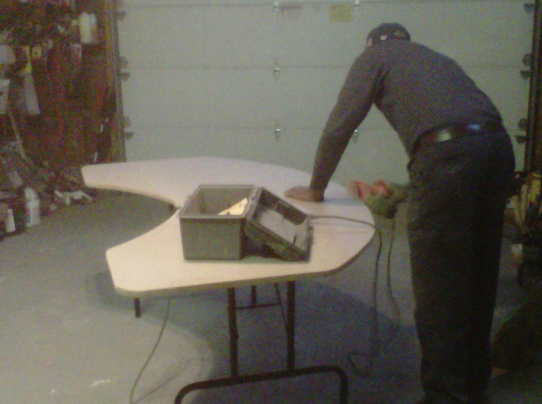 I presented the original plans to Daddy. We made a trip to Lowe's Home Improvement to get the lumber. I wasn't happy with any of the legs that were available. Daddy said that he had some folding table legs that he could cut down. That was even better. I really wanted a laminate table top, but we decided to paint it for now. I can add the laminate later.